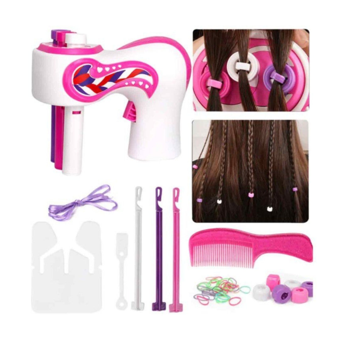 -Contenido del paquete: 1 máquina trenzadora, 9 pinzas decorativas, 3 tiradores de pelo, 3 piezas accesorias, 1 peine, 12 elásticos brillantes.